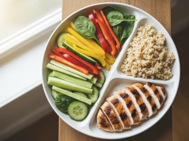 Обед — самый объемный прием пищи. Включите белок (мясо, рыба), гарнир из овощей или цельнозерновых круп, салат. Суп на нежирном бульоне — отличный способ создать насыщение при низкой калорийности.