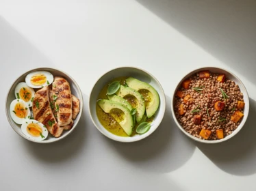 - Приготовить базовые компоненты: отварить крупы, запечь мясо, нарезать овощи