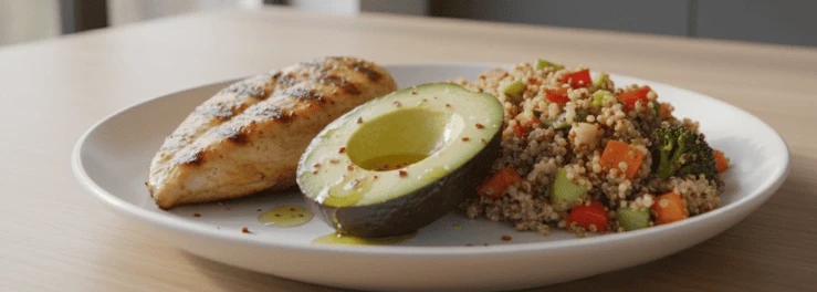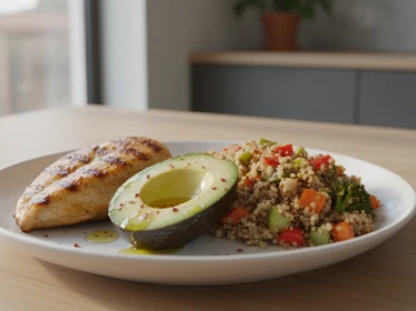 Начните с овощного супа на курином бульоне — он даёт ощущение сытости, но не перегружает. Далее — запечённая куриная грудка, гарнир из киноа и свежий салат с помидорами, огурцами и каплей оливкового масла. Идеально для поддержания веса и лёгкости в течение дня.