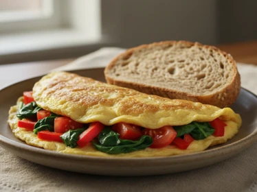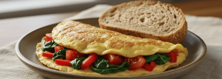 - Омлет из двух яиц с помидорами, шпинатом и болгарским перцем + ломтик цельнозернового хлеба — идеальный баланс полноценного белка и витаминов из свежих овощей. Лёгкий, питательный, насыщает надолго.