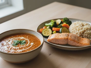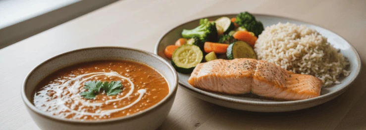 Томатный суп с чечевицей — плюс клетчатка и растительный белок. На второе — запечённый лосось или треска, бурый рис и тушёные овощи: брокколи, морковь, цуккини. Богато омега-3, железом и антиоксидантами. Отличный выбор для здоровья сердца и мозга.